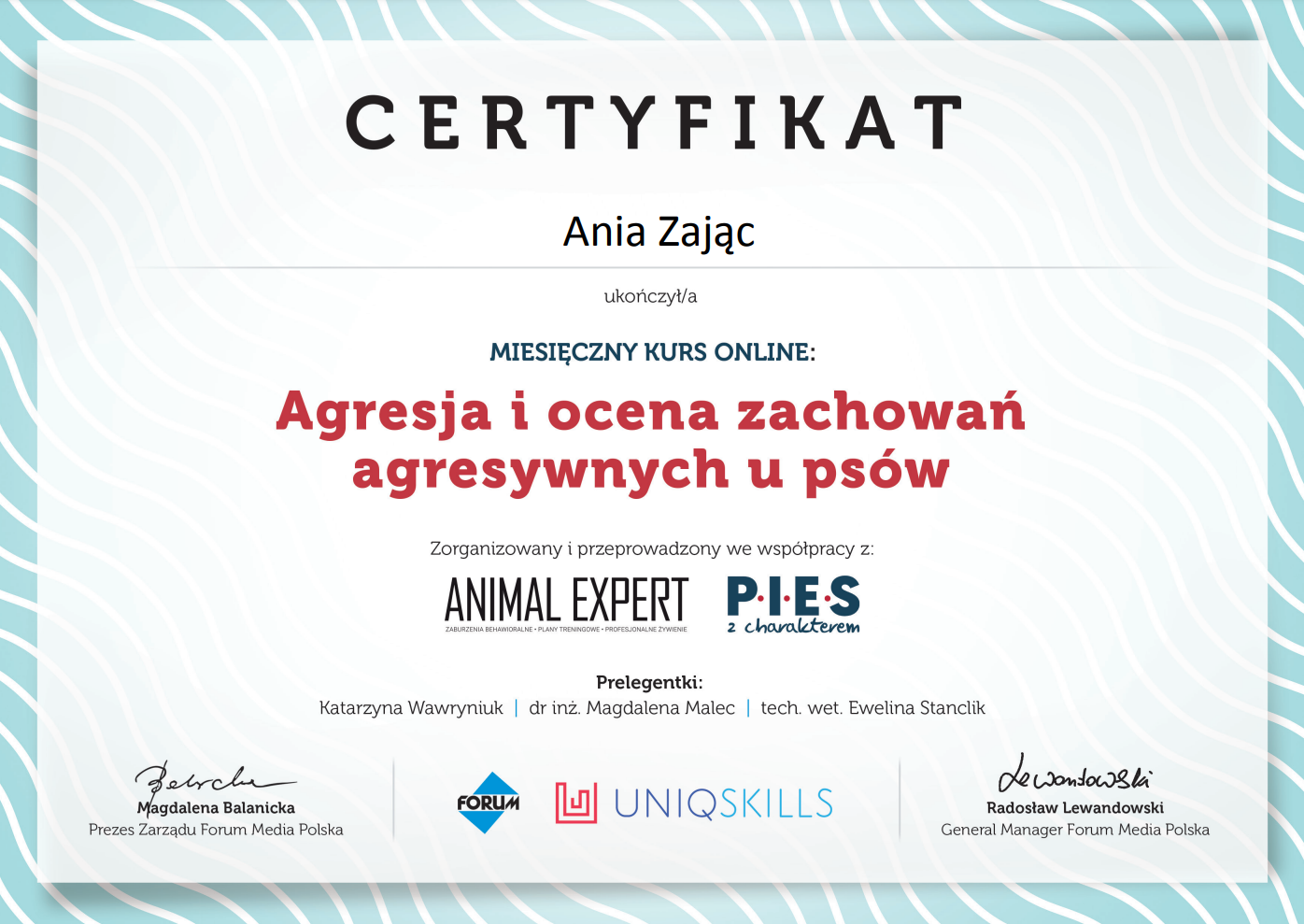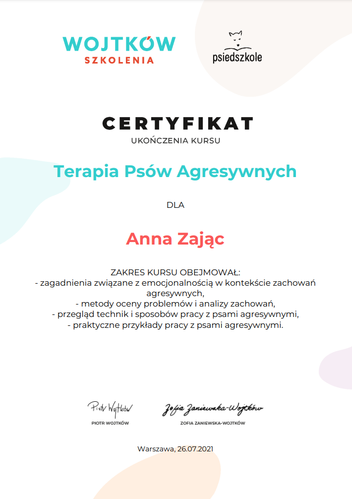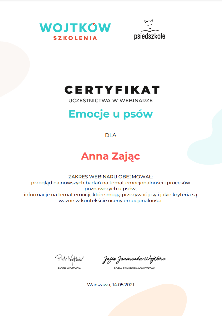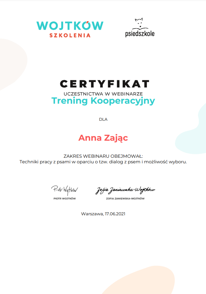 Moje kompetencje rozwijałam podczas studiów magisterskich na kierunku etyka – mediacje i negocjacje, a także studiów podyplomowych z zakresu coachingu z elementami psychologii. Nieustannie poszerzam swoją wiedzę, uczestnicząc w szkoleniach międzynarodowych, webinarach i analizując najnowsze badania z zakresu behawioryzmu.