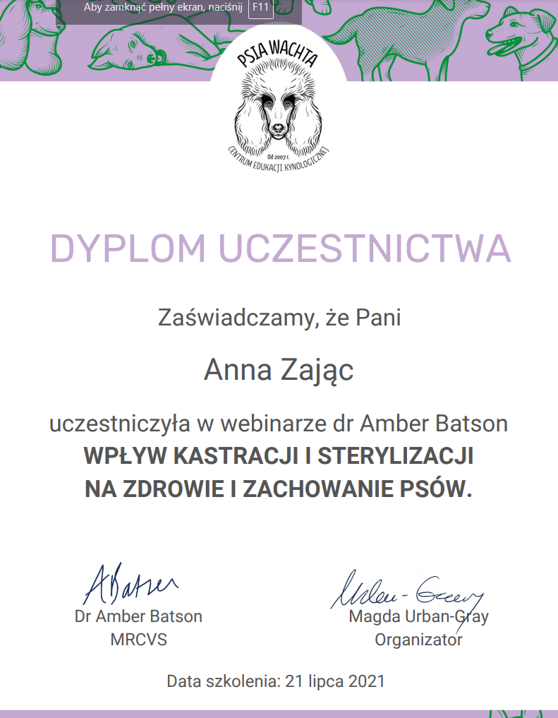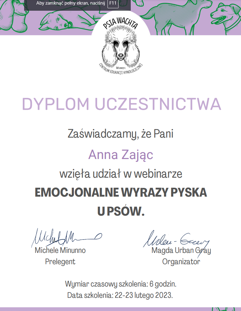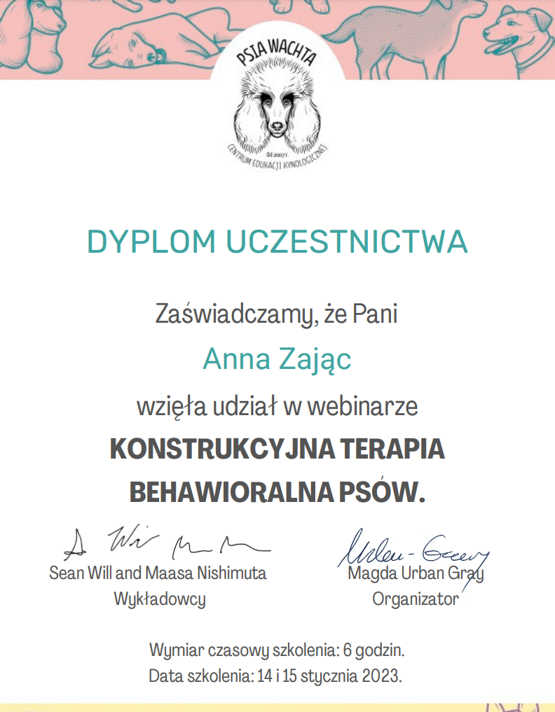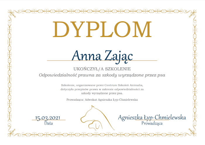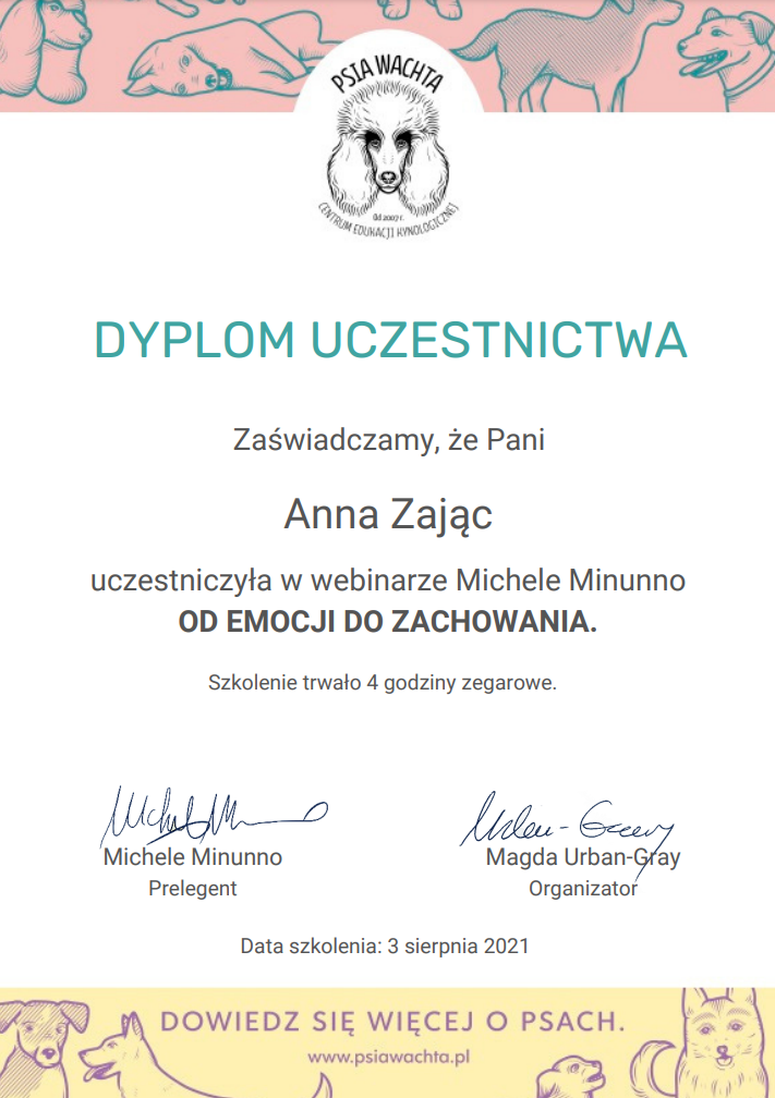 Moje kompetencje rozwijałam podczas studiów magisterskich na kierunku etyka – mediacje i negocjacje, a także studiów podyplomowych z zakresu coachingu z elementami psychologii. Nieustannie poszerzam swoją wiedzę, uczestnicząc w szkoleniach międzynarodowych, webinarach i analizując najnowsze badania z zakresu behawioryzmu.