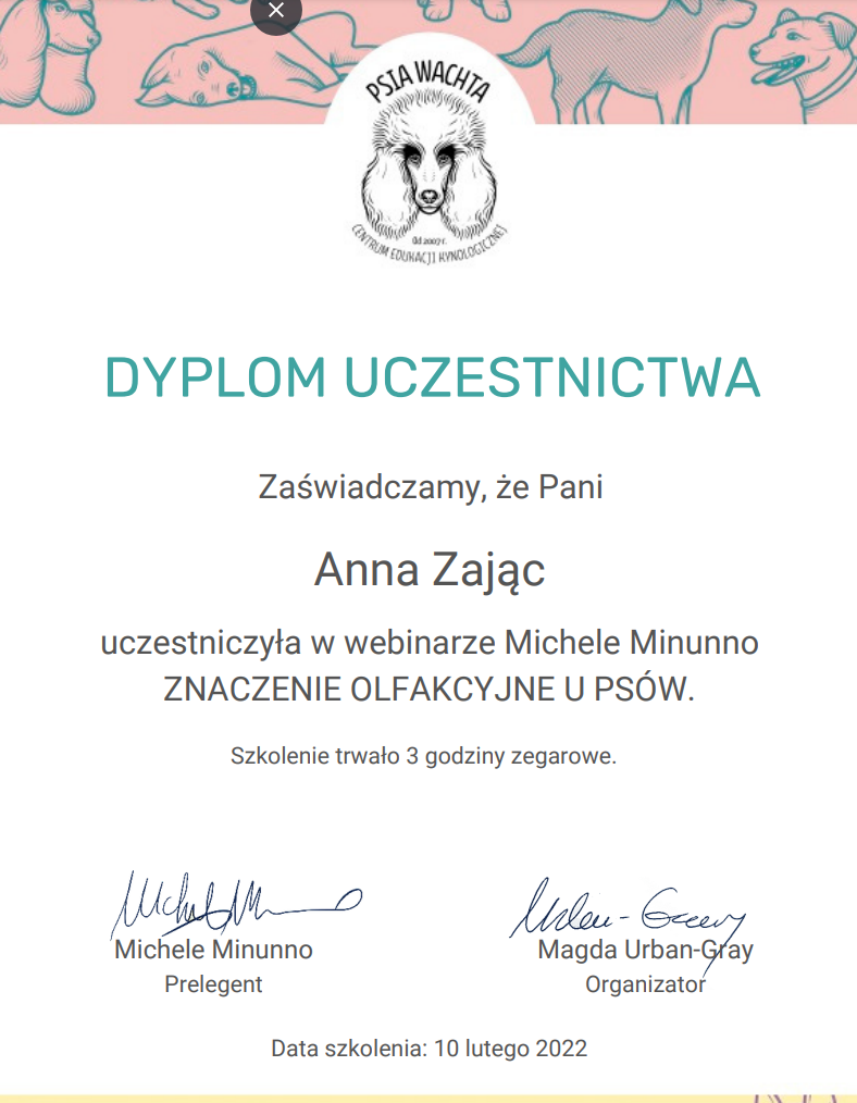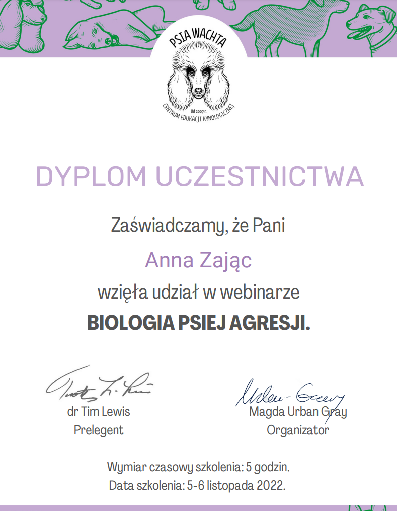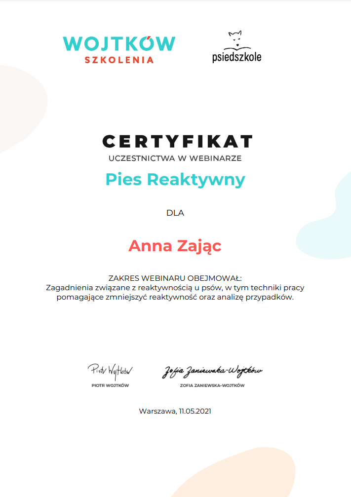 Nazywam się Ania Porębska (Zając) i jestem certyfikowanym trenerem oraz behawiorystą. Moja praca to połączenie pasji, wiedzy i doświadczenia – pomagam opiekunom psów zrozumieć potrzeby swoich pupili i budować z nimi silne, oparte na zaufaniu relacje.
