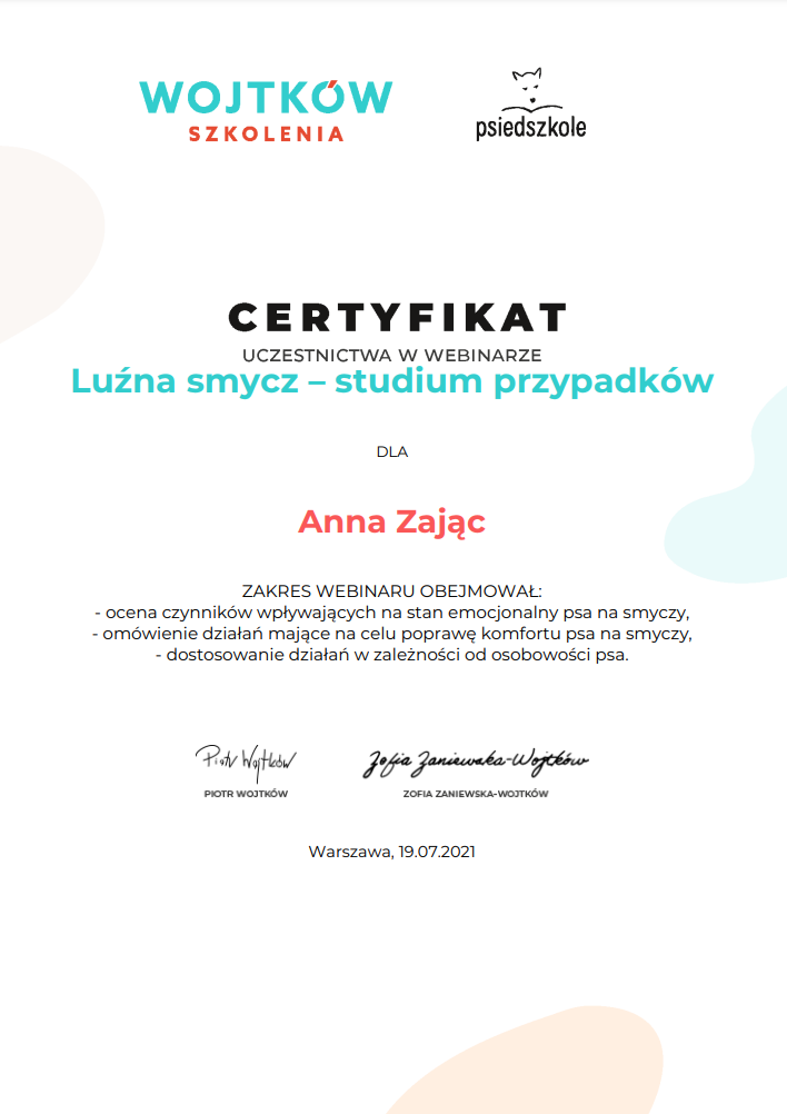 Moje kompetencje rozwijałam podczas studiów magisterskich na kierunku etyka – mediacje i negocjacje, a także studiów podyplomowych z zakresu coachingu z elementami psychologii. Nieustannie poszerzam swoją wiedzę, uczestnicząc w szkoleniach międzynarodowych, webinarach i analizując najnowsze badania z zakresu behawioryzmu.